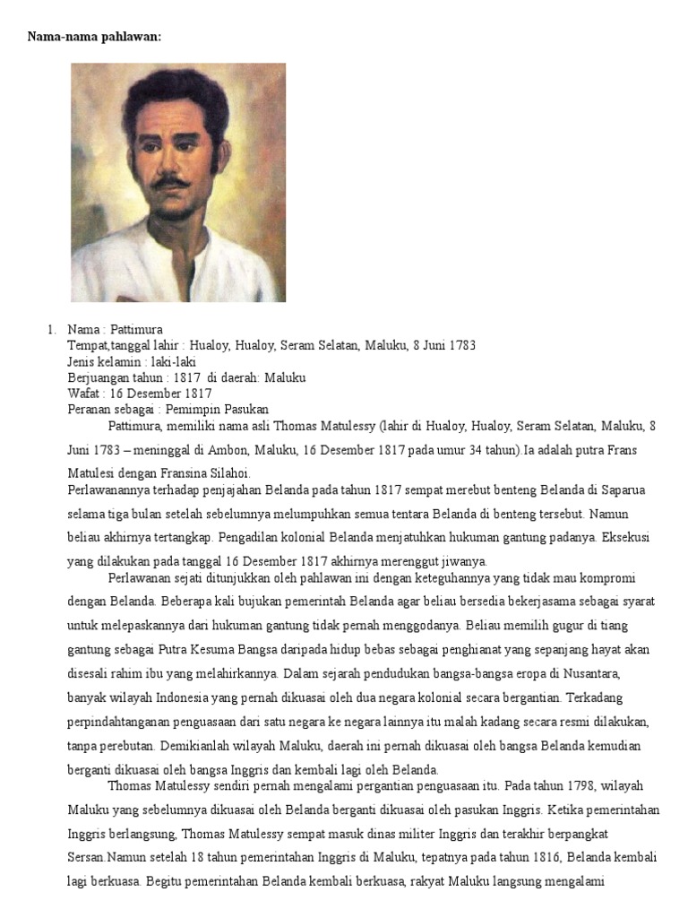 Tapi tahukah anda, banyak pahlawan indonesia mempunyai nama asli yang jarang terdengar. Thomas matulessy atau yang lebih dikenal dengan pattimura adalah pahlawan bangsa yang berperan sebagai panglima perang dalam perlawanan rakyat maluku dengan tentara voc belanda. Rela berkorban demi bangsa dan negara. Berikut ini adalah beberapa tokoh dalam peristiwa perlawanan terhadap penjajah: Sapija menulis, bahwa pahlawan pattimura tergolong turunan bangsawan dan.