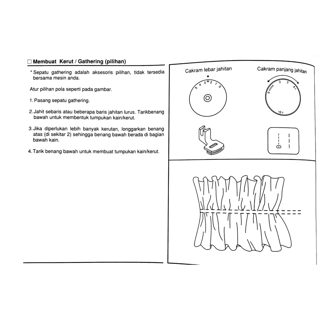 5 3 4 22 menjahit kerutan (gathering) * sepatu kerut merupakan aksesori opsional tidak . Gathering menghasilkan kerutan yang bergelombang menyerupai gelombang air danau lipan dan diterapkan pada. Dalam istilah busana hasil kerutan yang sedikit disebut gathering dan yang banyak disebut shirring. Kerutan dibentuk oleh 2 baris setikan lalu ditarik . Cara paling mudah dan praktis untuk menjahit kerutan sebenarnya adalah dengan memakai bantuan sepatu mesin jahit khusus yaitu gathering foot .
