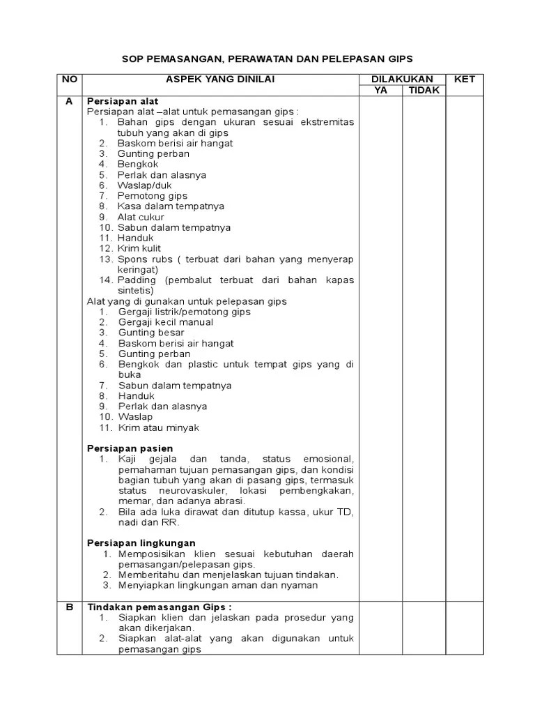Sop Pemasangan Gips : 1 - Prosedur pemasangan dan pencabutan gips · 1.. Dilengkapi standar operasional prosedur dan daftar tilik. Komplikasi yang terjadi umumnya berupa infeksi, penekanan . Pasang gips secara merata pada . Mengisi ember dengan air secukupnya. Prosedur pemasangan dan pencabutan gips · 1.